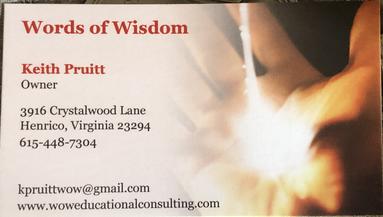 Words of Wisdom was created in 2008 in order to promote WOW in the classroom. Through the years, WOW has provided thousands of teachers proven strategies for helping students in writing, reading, vocabulary instruction, fluency, special needs populations such as English Language Learners and many other aspects of education. Whether it is PreK or Adult Education, Pruitt's vast experiences have uniquely prepared him to be of service to teachers around the nation.